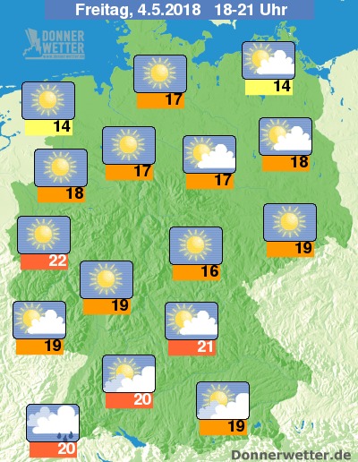 Heute Abend erwarten wir über weiten Landesteilen sonniges Wetter. Im Süden halten sich jedoch teils dichte Wolken, die jedoch nur vereinzelt Schauer bringen, sonst bleibt es landesweit trocken. Die Temperatur liegt bei 14 Grad an den Küsten und 22 Grad in Köln.