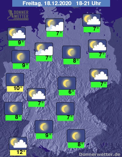 Die Temperaturen gehen von anfangs 6 bis 12 Grad bis kurz vor Mitternacht auf 2 bis 8 Grad zurück.