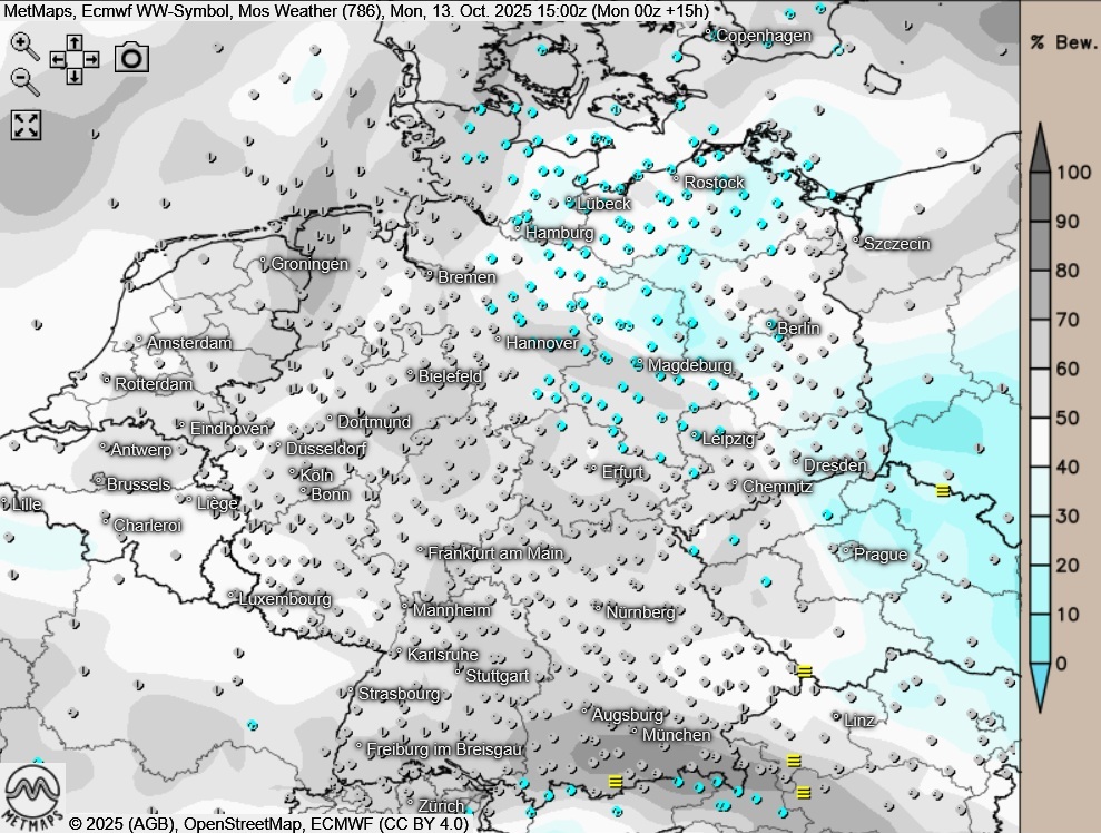 Die Wetter- und Temperaturkarte für Montagnachmittag (15:00 Uhr) nach Ecmwf:
