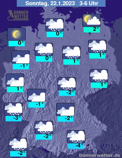 In der folgenden Nacht breiten sich die Schneefälle von Osten her weiter nach Westen aus und erreichen gegen Morgen in abgeschwächter Form auch die westlichen Landesteile. Im Norden bleibt es bei teils starker, teils aufgelockerter Bewölkung zum Großteil trocken, hier und da ist aber auch etwas Schnee oder Schneeregen möglich. Die Temperatur sinkt auf 2 Grad auf Rügen und bis -3 Grad im Saargau.