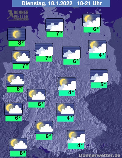 Heute Abend lockert und klart der Himmel vielerorts auf. Größtenteils dicht bewölkt bleibt es jedoch im Osten und Norden Deutschlands, allerdings bleibt es auch hier trocken. Die Temperatur liegt bei 4 Grad in München und rund 8 Grad in Köln.