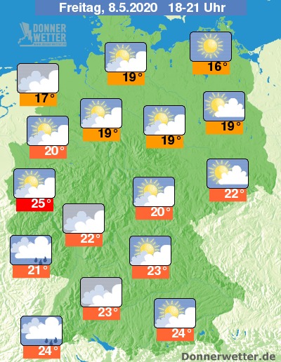 Die Temperaturen liegen am frühen Abend noch zwischen kühlen 16 Grad in Ostseenähe und frühsommerlichen 25 Grad am Oberrhein und der Kölner Bucht.