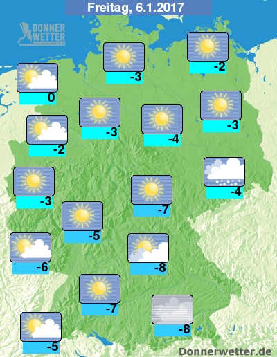 Auch am Freitag bleibt es kalt. Die Höchstwerte liegen fast landesweit unter dem Gefrierpunkt. Lediglich in Nordseenähe können Plusgrade erreicht werden. Dazu gibt es meist strahlenden Sonnenschein, nur im Erzgebirge fällt noch etwas Schnee. An den Alpen halten sich zudem dichte Nebelfelder, das Thermometer steigt hier nur auf bis zu -8 Grad.