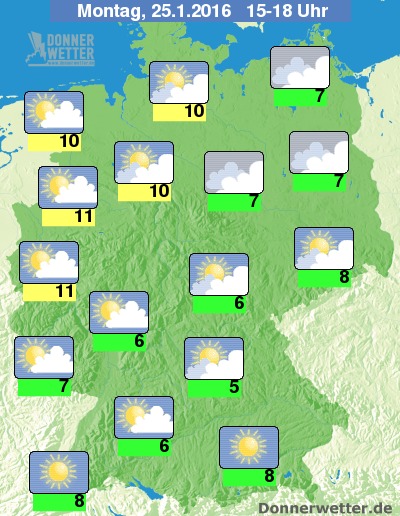 Heute Nachmittag halten sich im Norden und Osten noch meist dichte Wolken aus denen aber nur noch selten etwas Regen oder Sprühregen fällt. Besonders im Süden ist es nebel einzelnen Nebelfeldern oft heiter bis sonnig. In den übrigen Landesteilen gibt es meist einen Wechsel aus Sonne und Wolken, dabei bleibt es trocken. Die Temperatur steigt auf 5 Grad in Mittelfranken und bis 11 Grad in der Kölner Bucht.