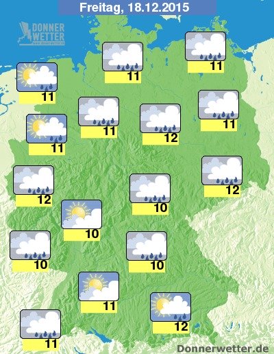 Heute ist es im äußeren Süden zunächst oft aufgelockert oder stark bewölkt und weitgehend trocken, im übrigen Land halten sich hingegen zumeist dichte Wolken und es fällt immer wieder Regen. Im Tagesverlauf ziehen auch im Alpenvorland Regenwolken auf, während die Niederschläge vom Westen Deutschlands her wieder abklingen und es nachfolgend auch gebietsweise auflockert. Bis zum Abend regnet es dann nur noch am Alpenrand, sowie im äußeren Osten des Landes. Vor allem im Norden bleibt es jedoch meist trüb. Die Temperatur steigt auf 10 Grad in Unterfranken und bis 12 Grad am Niederrhein.