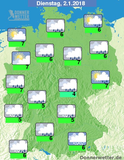 Am Dienstag kann es im Nordwesten vorübergehend mal aufheitern, sonst bestimmen jedoch dichte Wolken das Wettergeschehen und es fällt zeitweise Regen, im Süden und Südosten auch Schneeregen oder Schnee. Die Temperatur erreicht nasskalte 4 bis 7 Grad.