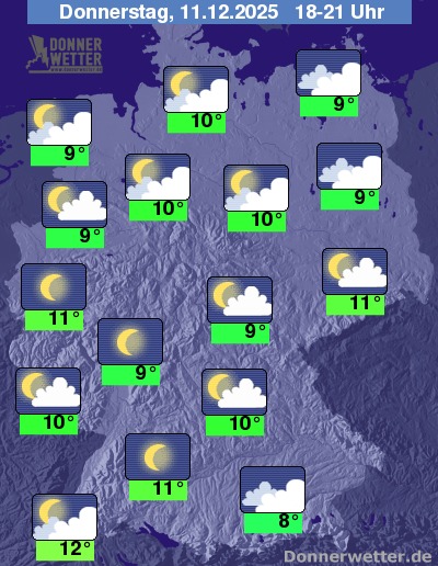 In der Nacht zum Freitag lockern die Wolken im Nordosten etwas auf, dagegen ziehen im Südwesten mehr und mehr Wolken herein. Im übrigen Land ist der Himmel oft locker bewölkt und gebietsweise auch sternenklar. Es bleibt bundesweit trocken bei Tiefstwerten von 8 Grad in Freiburg und bis 0 Grad in Jena.
