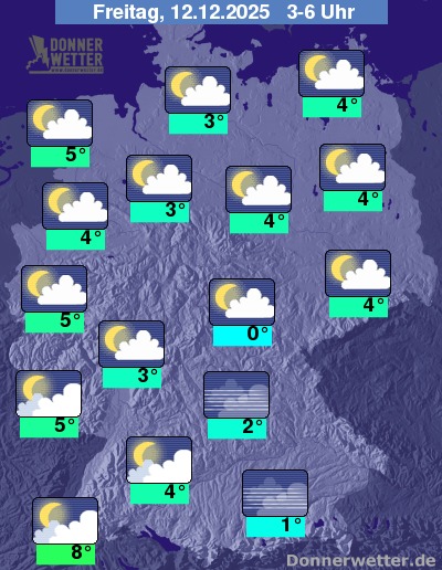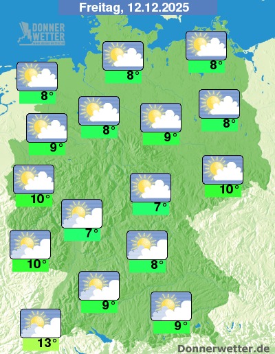 Am Freitag zeigt sich das Wetter zumeist stark oder dicht bewölkt, teilweise auch trüb. Gebietsweise scheint allerdings auch die Sonne. Es bleibt überall trocken bei Höchstwerten von 7 Grad in Erfurt und bis 13 Grad in Freiburg.