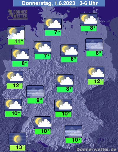 In der folgenden Nacht zeigt sich der Himmel über dem Land oft locker bewölkt oder auch sternenklar. Bei Tiefstwerten von 13 Grad in Freiburg und 7 Grad in Hannover bleibt es landesweit trocken.