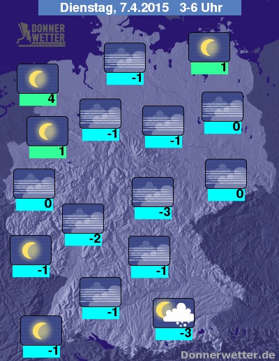 In der kommenden Nacht fällt an den bayerischen Alpen unter oft dichten Wolken noch gebietsweise etwas Schnee, sonst zeigt sich ein verbreitet sternenklarer Nachthimmel und es bleibt trocken, stellenweise bildet sich Nebel oder Dunst. Die Temperatur sinkt auf 4 Grad an der Nordseeküste und um -3 Grad in München.