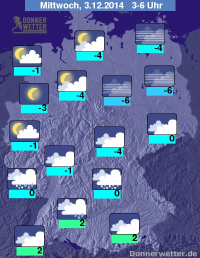 In der kommenden Nacht bleibt die Bewölkung in der Südhälfte Deutschlands weitgehend dicht und es fällt gebietsweise weiterer Schnee, Schneeregen oder Regen, dabei kann es teils sehr glatt werden. Nach Norden hin ist es häufig neblig-trüb oder stark bewölkt, nach Nordwesten hin auch gebietsweise leicht bewölkt, dazu bleibt es trocken. Die Temperatur sinkt auf 2 Grad in Konstanz und bis -6 Grad auf der Mecklenburger Seenplatte.