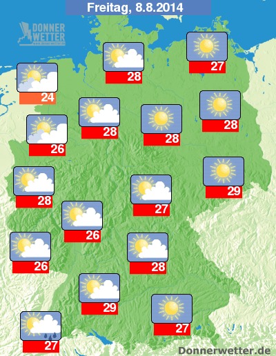 Heute erwarten wir einen verbreitet freundlichen Sommertag mit viel Sonnenschein und erst zum Abend möglichen Schauern und Gewittern im äußeren Westen und Südwesten. Vor allem Badefreunde sollten sich den Tag u.U. nicht entgehen lassen, denn die Tendenz für die kommenden Tage verheißen eher leicht rückläufige Temperaturen. Die heutigen Höchstwerte erreichen etwa 24 Grad in Meppen und gut 29 Grad in der Lausitz.