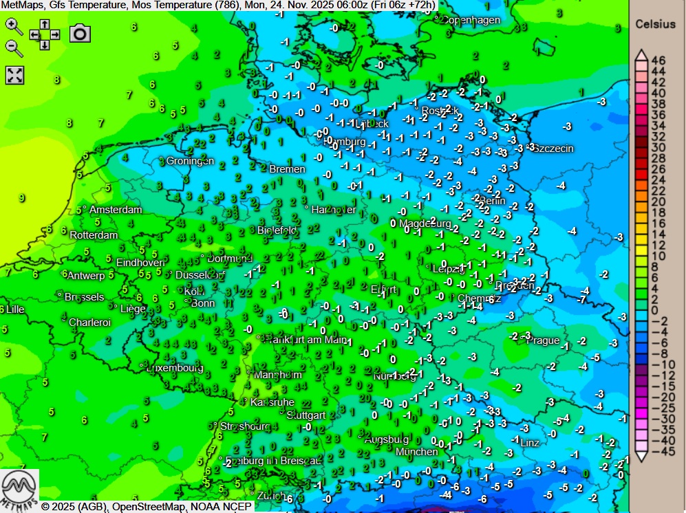 Die Temperatur- und Wetterkarte für Montagfrüh (06:00 Uhr) nach GFS: