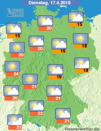 Im Südosten und Osten können sich örtlich nochmals mächtigere Haufenwolken mit Schauern bilden. Sonst scheint abgesehen von einigen Schönwetterwolken, oder durchziehenden Wolkenschleiern verbreitet die Sonne. Die Temperaturen steigen am Nachmittag verbreitet auf 16 bis 20, im Süden und Westen auch gebietsweise auf 20 bis 24 Grad. Kühler bleibt es im Küstenbereich von Nord- und Ostsee, sowie auf den Mittelgebirgen. Der Wind weht meist nur schwach bis mäßig.