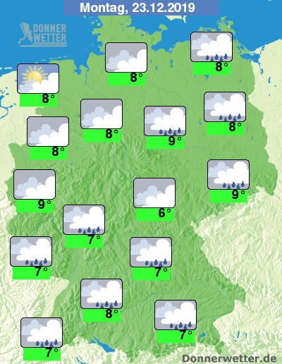 Am 1. Weihnachtsfeiertag im Norden zunehmend aufheiternd und trocken, sonst überwiegend dichte Wolken, vor allem über der Südhälfte zeitweise, sonst nur gelegentlich Regen. 4 bis 9 Grad.