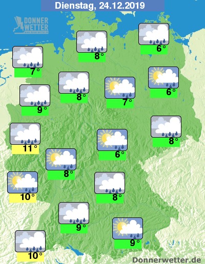 An Heiligabend zieht ein Tiefausläufer von West nach Ost über Deutschland hinweg. Über der Osthälfte bleibt es vormittags noch trocken und teils aufgelockert bewölkt, sonst ist es aber meist stark bewölkt und es fällt zeitweise Regen. Die Temperatur steigt auf 6 Grad an der Ostsee und bis 11 Grad in der Kölner Bucht
