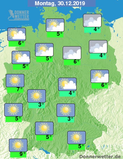 Heute ist es über der Südwesthälfte Deutschlands verbreitet sonnig, im Norden und Osten hingegen oft stark und nur gebietsweise aufgelockert bewölkt. Es bleibt allerdings überall trocken bei Höchstwerten zwischen 3 Grad in Oberfranken und bis 9 Grad im Oberrheingraben.