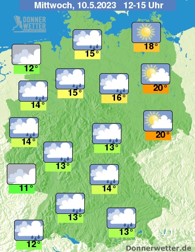 Heute Nachmittag zieht über das Bundesgebiet überwiegend starke oder dichte Bewölkung hinweg, dabei bilden sich vielerorts Schauer. Im Nordosten und äußeren Osten ist es hingegen noch oft heiter und dazu trocken. Jedoch nimmt die Bewölkung auch hier insgesamt etwas zu. Die Temperatur liegt bei 11 Grad im Saargau und bis 20 Grad in der Lausitz.