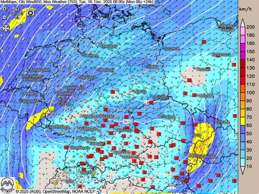 Die Böen- / Wetterkarte sowie die Temperaturkarte für Dienstagmorgen (06:00 Uhr) nach GFS: