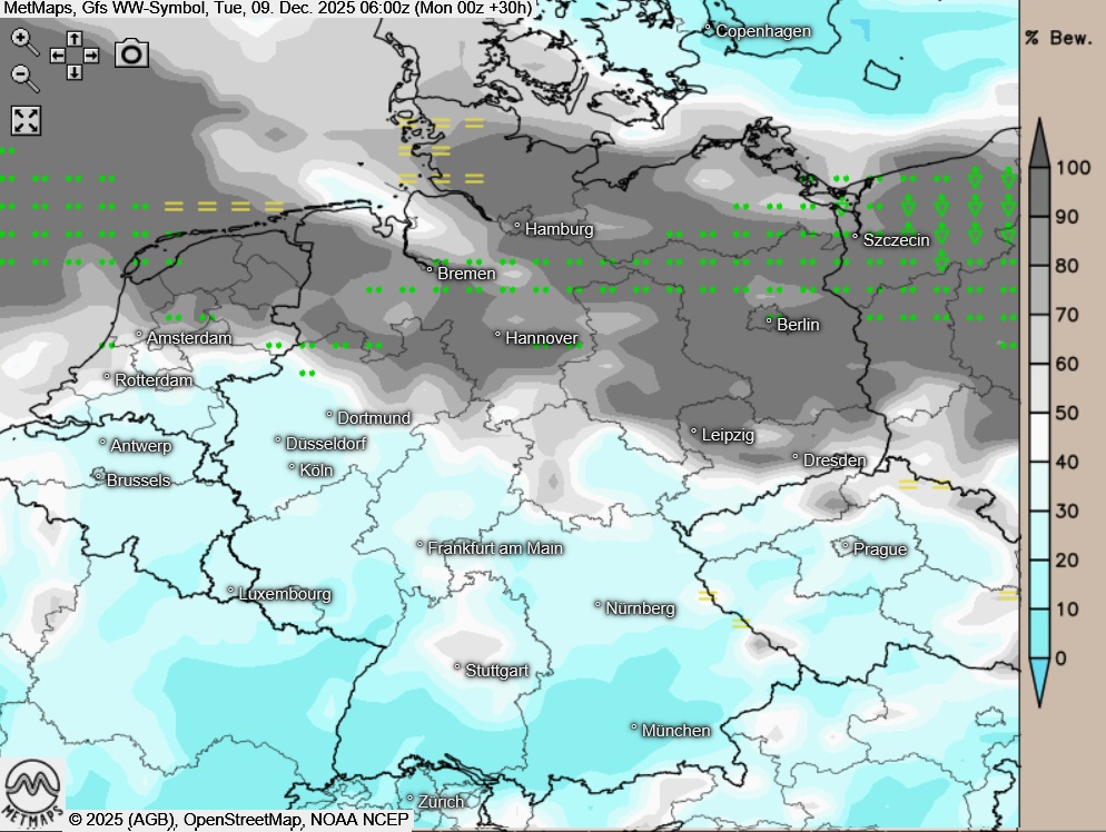 Am Dienstag zeigt sich der Himmel über dem Norden Deutschlands bedeckt, dabei fällt zeitweise Regen. Zur Mitte hin gibt es heute ebenfalls viele Wolken, es bleibt aber meist niederschlagsfrei. In den südlichen Landesteilen kann sich am Dienstag teils zäher Nebel oder Hochnebel halten, abseits davon ist es heiter oder sonnig.