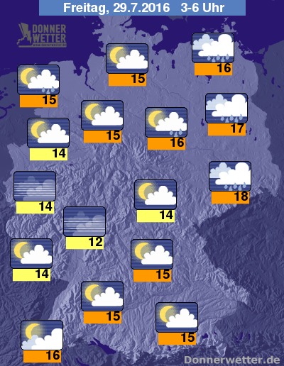 In der kommenden Nacht bilden sich zu Beginn vor allem über der Osthälfte Deutschlands weitere Schauer und örtliche Gewitter. Weiter nach Westen hin ist es bereits meist klar oder aufgelockert bewölkt und trocken. Zum Morgen hin ist es von Sachsen bis in die Osthälfte von Meckelnburg-Vorpommern weiterhin meist dicht bewölkt und es bilden sich zeitweise Schauer und stellenweise Gewitter, sonst ist es dann verbreitet nur locker bewölkt oder sternenklar und auch trocken. Die Temperatur sinkt auf 18 Grad in Dresden und bis 12 Grad am Westerwald.