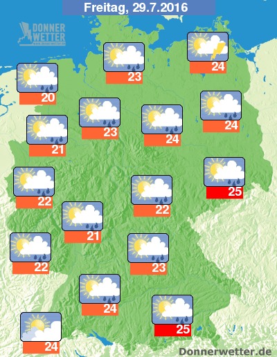 Am Freitag bilden sich besonders im Nordosten Deutschlands noch wiederholt Schauer und zum Teil kräftige Gewitter, aber auch sonst ziehen nach möglichen heiteren Abschnitten immer wieder dichte Wolken durch und es sind vielerorts einzelne Schauer, regional auch Gewitter möglich. Die Temperatur steigt auf 20 Grad in Wilhelmshaven und 25 Grad in München.