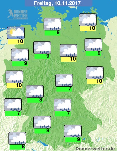 Mit auffrischendem Südwest bis Westwind ziehen dichte Regen- und örtliche Schauerwolken über Deutschland hinweg. Nur selten findet sich mal eine Lücke für die Sonne. Erst am Abend klart der Himmel über Teilen Norddeutschlands auf. Die Temperaturen erreichen am Nachmittag 6 bis 11 Grad.