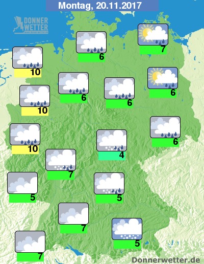 Die neue Woche startet dunkel, grau und nass, nur im äußeren Südwesten bleibt es weitgehend trocken, sonst regnet es bei dichten Wolken immer wieder. Im Süden und Osten ist auch Schnee und Schneeregen möglich. Die Temperatur steigt auf 4 Grad im Eichsfeld und bis 10 Grad im Rheinland.