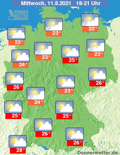 Heute Abend ist es weiterhin verbreitet heiter, besonders im Südwesten, aber auch im Küstenumfeld ist es auch über weite Strecken sonnig. Hier und da ziehen aber auch einige Wolken durch, dabei bleibt es trocken. Die Temperatur liegt bei 22 Grad in Wilhelmshaven und bis 28 Grad in Freiburg.