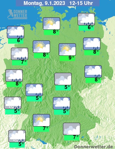 Heute Nachmittag ziehen zum Großteil viele und meist dichte Wolken über Deutschland hinweg, hier und da lockert es etwas auf, jedoch fällt vielerorts Regen, im Süden zum Teil auch Schneeregen. Die Temperatur liegt bei 5 Grad am Oberrhein und 9 Grad in der Magdeburger Börde.