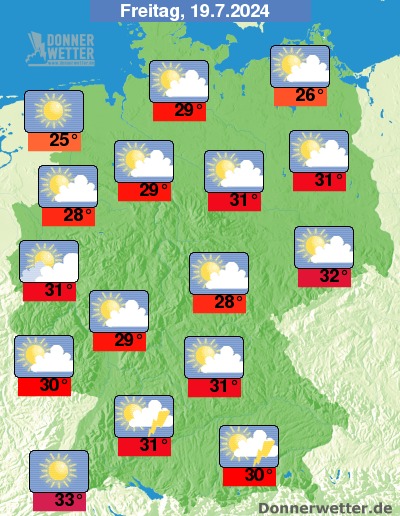 Am Freitag ist es über dem Bundesgebiet verbreitet heiter oder sonnig, im Osten und Süden sind jedoch einige Quellwolken möglich, hier besteht ein leichtes Schauer- und Gewitterrisiko, ansonsten bleibt es trocken. Die Temperatur steigt auf 25 Grad in Cuxhaven und bis 33 Grad in Freiburg.