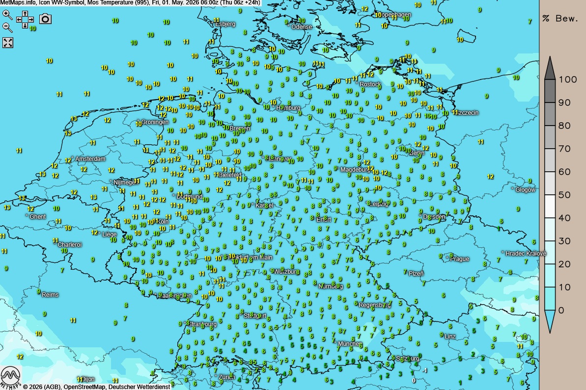 Die Wetter- und Temperaturkarten für 06:00 und 12:00 Uhr sowie die 24-Stunden-Sonnenscheindauer für Europa nach ICON: