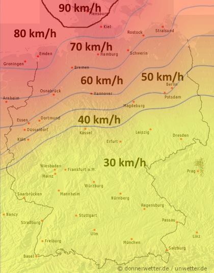 Die folgende Karte zeigt die zu erwartenden Windspitzen zwischen heute Nachmittag (15:00 Uhr) und der kommenden Nacht (03:00 Uhr):