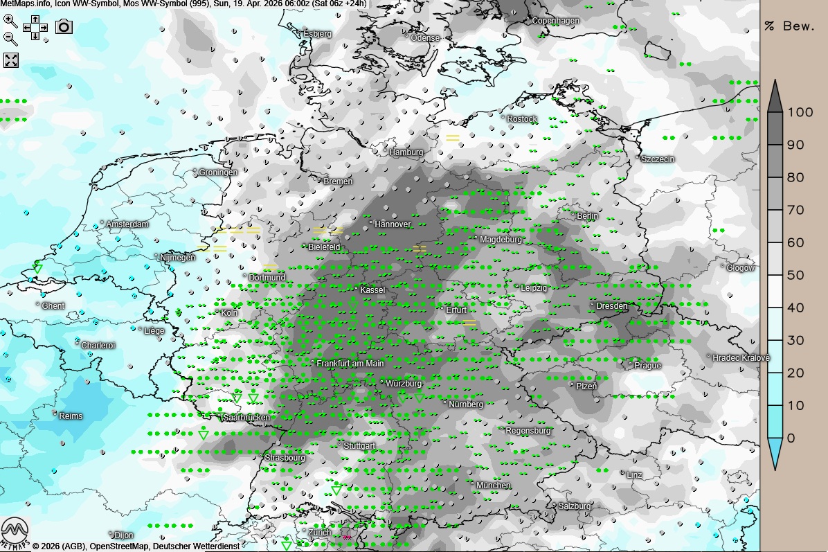 Am Sonntag zeigt sich der Himmel über dem Süden und Südosten anfangs stark bewölkt, dabei muss zeitweise mit Schauern und einzelnen Gewitter gerechnet werden. In den übrigen Landesteilen ist es teils stark, teils aufgelockert bewölkt und es fallen zeit- und gebietsweise Schauer.