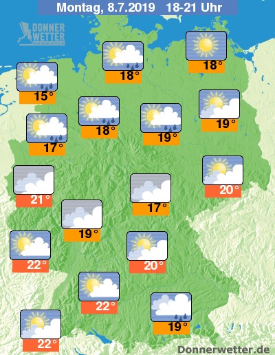 Am späteren Abend bleibt der Himmel in der Mitte und im äußersten Nordwesten bedeckt, sonst ist es teils locker, teils aufgelockert bewölkt. Mit Niederschlägen muss meist nicht mehr gerechnet werden.