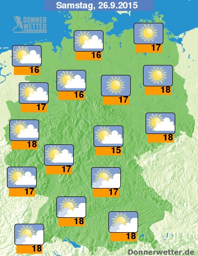 Am Samstag zeigt sich im Süden ein Mix aus Sonne und Wolken, dabei kann es vor allem nach Südosten hin auch gebietsweise stark bewölkt sein. Im übrigen Bundesgebiet ist es hingegen verbreitet nur locker bewölkt oder sogar sonnig. Es bleibt landesweit trocken bei Höchstwerten von 15 Grad im Coburger Land und bis 18 Grad in Berlin.