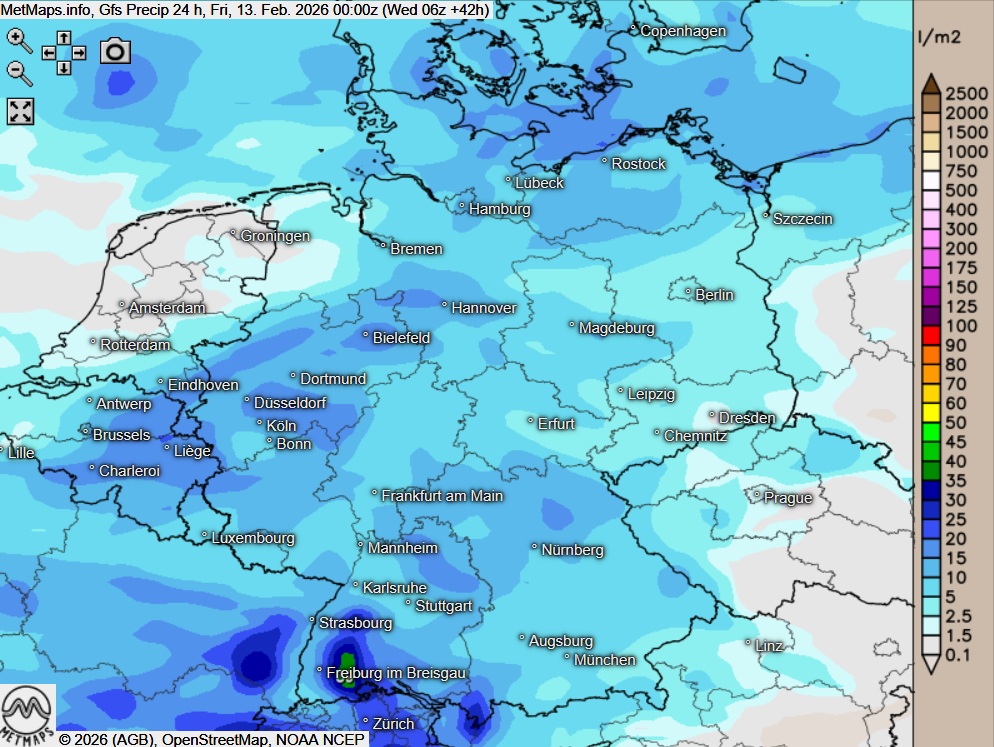 Am Donnerstag (Weiberfastnacht) zeigt sich der Himmel über den meisten Landesteilen  stark bewölkt, dabei fällt vor allem in den Staulagen der Mittelgebirge teils ergiebiger Regen, im äußersten Norden und Nordosten auch Schnee. Es ist windig bis stürmisch, in den Höhenlagen auch Sturm oder schwerer Sturm.