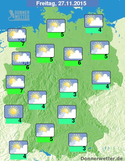 Am Freitag ist es über dem Land oft locker oder aufgelockert bewölkt, vor allem über der Südosthälfte ist es auch gebietsweise sonnig, dazu bleibt es vorerst überall trocken. Gegen frühen Abend kommen im Nordwesten und später auch im Westen dichte Wolken und zeitweiliger Regen auf, sonst bleibt es aber trocken. Die Temperatur steigt auf 3 Grad in München und bis 7 Grad im Rheinland.