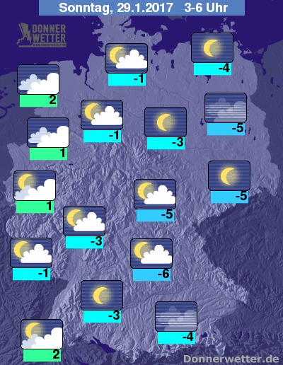 In der Nacht zum Sonntag klart der Himmel über der Osthälfte der Republik meist auf oder es ziehen nur lockere Wolkenfelder durch. Mehr und zum Teil auch dichte Wolken halten sich vom Emsland bis zum Nieder- und Mittelrhein. In den übrigen Landesteilen ist es meist locker bis wechselnd bewölkt. Es bleibt bundesweit trocken bei Tiefstwerten von 2 Grad in Emden und bis -6 Grad in Oberfranken.
