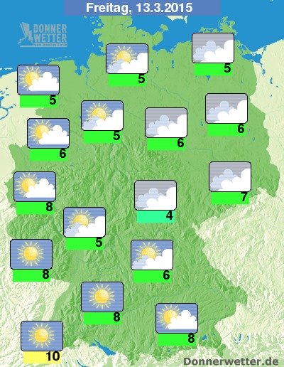 Heute ist es im Norden, Osten und der Mitte Deutschlands bereits meist stark bewölkt, dazu ist es aber zumeist trocken. Weiter nach Süden und Westen ist es vor allem am Vormittag noch häufig heiter bis sonnig. Im Tagesverlauf nehmen die Wolkenanteile aber auch hier häufig zu, dabei bleibt es aber trocken. Die Temperatur steigt auf 4 Grad im Thüringer Becken und bis 10 Grad im Oberrheingraben.