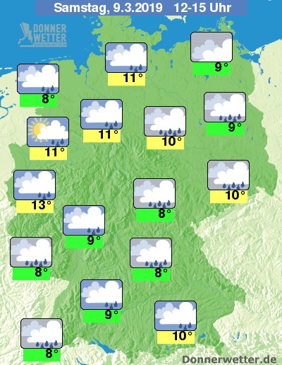Heute Nachmittag bleibt es meist dicht bewölkt, nur selten zeigen sich mal Auflockerungen. Über der Südhälfte fällt zeitweise Regen, weiter nach Norden hin bilden sich wiederholt Schauer und örtlich sind auch kurze Gewitter möglich. Die Temperatur liegt bei 8 Grad im nördlichen Emsland und etwa 13 Grad im Rheinland. Es weht ein teils stürmischer Wind, an den Küsten herrscht oft Sturm.
