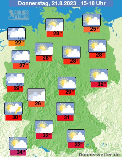 In der Süd- und Osthälfte des Landes zeigt sich der Himmel am Nachmittag zumeist heiter oder es ist sonnig. In der Nord- und Westhälfte ist es werchselnd, zeitweise auch stark bewölkt, und von Westen und Südwesten breiten sich Schauer und Gewitter aus, die im Nachmittagsverlauf landeinwärts vorankommen. Örtlich Unwetterpotential.