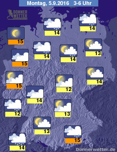 In der bevorstehenden Nacht bleibt es im Süden Deutschlands überwiegend bedeckt und besonders am Alpenrand fällt zeitweise, teils auch langanhaltender Regen. Meist dicht bewölkt mit wiederholten Schauern, örtlich auch Gewittern ist es im Bereich des Ostseeumfeldes, sonst ist es im Norden teils klar, gebietsweise aber auch stark bewölkt, dazu sind aber nur vereinzelt Schauer möglich. Im großen Rest des Landes ist es oft nur leicht, hier und da aber auch stark bewölkt, jedoch größtenteils trocken. Die Temperatur sinkt auf 15 Grad in Köln und bis 12 Grad im Thüringer Becken.