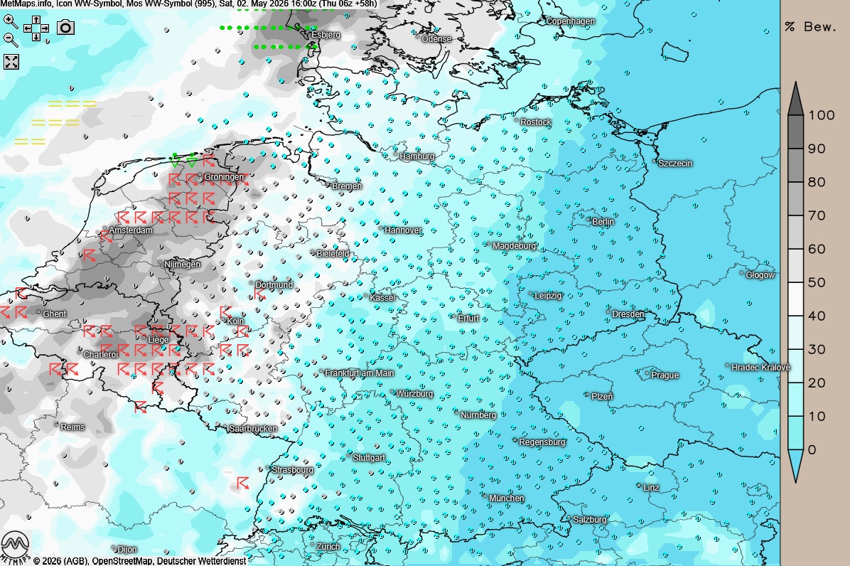 Im Tagesverlauf nimmt in der Westhälfte die Bewölkung zu. Ab dem Nachmittag wird es dann spannend: Im Westen und im äußersten Südwesten ziehen örtlich teils kräftige Schauer und einzelne Gewitter auf, die das Ende der stabilen Wetterphase markieren.