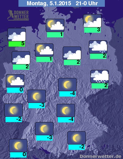 Heute Abend zeigt sich der Himmel über der Südhälfte des Landes verbreitet sternenklar, und es bleibt trocken. Weiter nach Norden ist es dagegen meist stark, zum Teil auch aufgelockert bewölkt, dazu bleibt es meist trocken, besonders nach Osten hin kann aber gelegentlich etwas Regen, Schneeregen oder Schnee fallen. Im Nordosten bildet sich stellenweise Nebel. Die Abendtemperatur liegt bei 5 Grad an der Nordsee und um -4 Grad in Niederbayern.