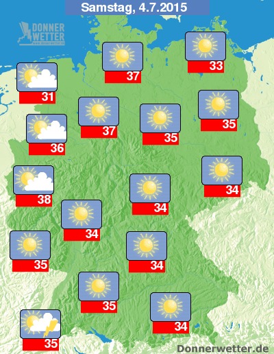 Am Samstag erwarten wir einen verbreitet sonnigen oder nur leicht bewölkten Tag. In den westlichsten Landesteilen können jedoch gebietsweise auch mal dichtere Quellwolken aufsteigen, dazu besteht aber nur ein geringes Schauer- und Gewitterrisiko. Sonst bleibt es trocken. Die Temperaturen steigen auf subtropische Werte zwischen 31 Grad an der Nordsee und extrem heißen 38 Grad in Köln.