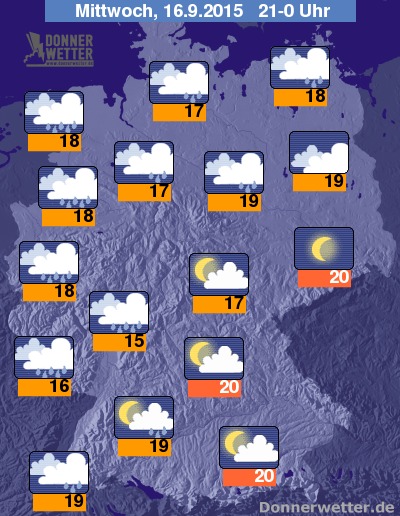 Heute Abend ist es vom Süden bis in den Osten Deutschlands oft nur gering oder locker bewölkt und dazu trocken. Über praktisch der gesamten Nordwesthälfte des Landes ziehen hingegen weitgehend dichte Wolken hinweg und es fällt zum Teil kräftiger, langanhaltender und auch ergiebiger Regen. Dabei besteht die Gefahr durch Aquaplaning und teils sehr schlechten Sichtverhältnissen. Die Abendtemperatur liegt bei 20 Grad in Leipzig und etwa 15 Grad am Westerwald. Dazu weht im Norden und Westen ein teils frischer bis starker, im Nordseeumfeld auch ein stürmischer Wind mit möglichen Sturmböen.