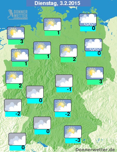 Heute ist es vom Südwesten, über die Mitte Deutschlands bis nach Nordosten meist dicht bewölkt und vor allem nach Nordosten hin fällt dazu zeitweise Schnee. In den übrigen Landesteilen ist es oft stark, gebietsweise aber auch aufgelockert bewölkt, dabei bleibt es aber größtenteils trocken. Im Süden hält sich stellenweise zäher Nebel. Die Temperatur steigt auf -3 Grad in München und bis 3 Grad in Dresden.
