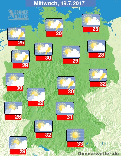 Der Tag startet vielfach sonnig, nur im Südwesten halten sich bereits schon einige hohe und mittelhohe Wolkenschleier. Am Nachmittag bilden sich in der schwül-heißen Luft erste örtliche Gewitterzellen. Zum Abend werden die Gewitterherde im Nordwesten und Norden zahlreicher und intensiver, später ziehen auch in den Westen teils kräftige Schauer und Gewitter herein. Im Osten und Süden sollte es hingegen überwiegend noch trocken bleiben. Die Höchsttemperaturen erreichen Werte von 26 bis 35 Grad. Etwas kühler bleibt es im Küstenumfeld von Nord- und Ostsee, auf den Inseln, sowie auf den Gipfeln der Mittelgebirge.