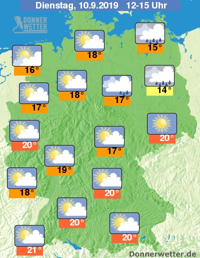 Die Temperaturen bewegen sich im Norden und Nordosten meist nur zwischen 14 und 18 Grad, sonst werden gebietsweise auch 20 Grad oder etwas mehr erreicht.